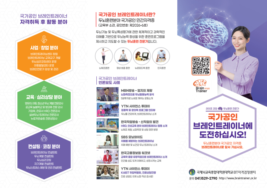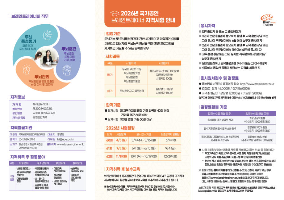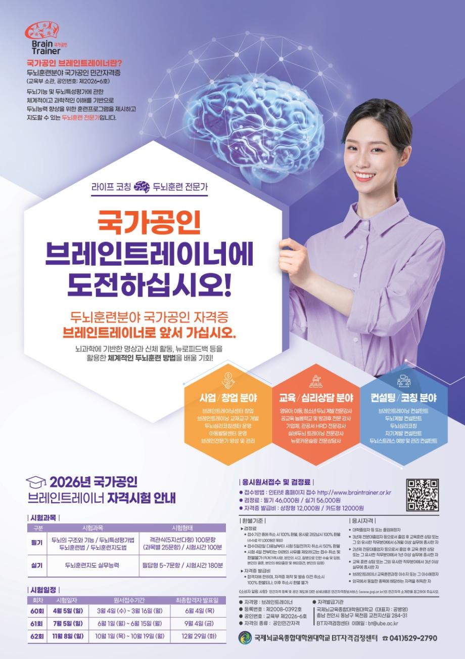 2026년도 국가공인 브레인트레이너 자격시험 시행 계획 공고 2026/02/09 조회수 119 작성자 운영자 [ 2026년도 국가공인 브레인트레이너 자격시험 시행 계획 공고] 자격기본법 제19조에 의거하여 공인된(공인증서 제2023-3호) 국가공인 브레인트레이너 자격시험의 2026년도 시행 계획을 브레인트레이너 자격검정관리운영규정 제4조에 따라 다음과 같이 공고합니다. <국제뇌교육종합대학원대학교 총장> 1. 검정기준 두뇌기능 및 두뇌특성평가에 관한 체계적이고 과학적인 이해를 기반으로 대상자의 두뇌능력 향상을 위한 훈련프로그램을 제시하고 지도할 수 있는 자 2. 시험내용 3. 시행일정 (※아래쪽에 첨부파일 있음) (※ 동일 회차에 필기 및 실기 시험을 동시에 응시가능) (※ 지역별 시험 장소는 추후 홈페이지에 공고 함) 4. 응시자격 및 응시자격 심사 ○ 응시자격 - 4년제 대학졸업자 등 또는 그 졸업예정자 - 3년제 전문대졸업자 등으로서 졸업 후 교육·훈련·상담 또는 그와 유사한 직무분야에서 6월 이상 실무에 종사한 자 - 2년제 전문대졸업자 등으로서 졸업 후 교육·훈련·상담 또는 그와 유사한 직무분야에서 1년 이상 실무에 종사한 자 - 교육·훈련·상담 또는 그와 유사한 직무분야에서 3년 이상 실무에 종사한 자 - 브레인트레이너 교육훈련과정 이수자 또는 그 이수예정자(시험일 전일까지 이수완료) - 외국에서 동일한 종목에 해당하는 자격을 취득한 자 (외국자격의 경우 별도 문의) ※ 응시자격은 최초 시험을 응시하기 전에 충족하고 있어야 하므로 시험응시 전에 꼭 확인하셔서 불이익이 없도록 해 주시기 바라며, 경력사항에 대한 부분은 추후 경력증명서를 제출하여야 하므로 사전에 [응시자격심사서류] 접수와 관련한 공지사항을 참조하여 주시기 바랍니다. ○ 응시자격 심사 - 필기시험 실기시험 두 가지 합격자는 응시자격심사서류 접수기간 이내(최대 2회차)에 응시자격 증빙서류를 제출하고 심사를 통과하였을 때 최종합격 처리가 됨. - 응시자격 심사 기준일은 최초로 합격한 필기 또는 실기 시험일 (※ 응시자격 심사 결과 부적격일 경우, 시험 합격은 무효 처리됨) 5. 자격취득 후 보수교육 이수 ○ 브레인트레이너 자격검정관리운영규정 제16조와 제104조 규정에 의거하여 직무능력 유지 향상을 위하여 보수교육을 이수해야 자격유효기간이 갱신됩니다. - 보수교육 이수기준 : 자격취득일로부터 유효기간 3년 이내에 12시간 이상 이수하여야 함. ※ 보수교육을 12시간 이상 이수 시 자격만료일 이후 자격유효기간(3년)이 갱신됩니다. ○ 브레인트레이너 자격검정관리운영규정 제16조와 제104조, 제105조 규정에 의거하여 자격유효기간 (3년)내에 12시간 이상의 보수교육을 이수하지 못한 경우, 유효기간 경과일로부터 3년의 자격취소 유예기간을 두며, 자격취소 유예기간(3년) 내에도 보수교육을 이수하지 못한 경우 자격이 취소됩니다. ○ 보수교육은 온라인과 오프라인으로 운영되며, 온라인 교육의 경우 1시간당 5,000원 ~10,000원, 오프라인의 경우 1시간당 10,000원 ~ 50,000원으로 각 교육에 소요되는 실습 기자재비 등 운영상황에 따라 차등 책정될 수 있습니다. ※ 보수교육 일정 및 비용 등에 대한 부분은 상황에 따라 변동될 수 있으며, 자세한 사항은 홈페이지 공지사항을 참조하여 주시기 바랍니다. 6. 응시 원서 접수 ○ 접수방법 : 인터넷 접수 https://www.braintrainer.or.kr [바로가기] ○ 검 정 료 : 필기 46,000원, 실기 56,000원 (각각 1,000원은 수수료로 환불시 제외됨) 7. 검정료 환불기준 ○ 환불요율 - 응시료 과오납 : 기간에 관계없이 100% 환불 (수수료 각 1,000원은 제외) - 원서접수 기간 내 : 100% 환불 (수수료 각 1,000원은 제외) - 원서접수 종료 후 시험 5일전 까지 : 50% 환불 (수수료 포함 금액에서 50% 환불) - 시험 4일전 부터 : 아래 환불 사유를 제외하고 환불불가 ○ 환불 사유 (아래의 사유의 경우 시험종료 후 30일까지 환불신청서와 증빙서류를 제출한 경우에는 100% 환불가능 (수수료 각 1,000원은 제외)) ① 본인의 사고, 질병으로 인한 수술 및 입원 : · 제출서류 : 입원을 입증하는 서류 (입원확인서 또는 진단서 등), 신분증 사본 (단, 입원기간 내 시험일이 포함되어 있어야 함.) ② 직계가족 사망의 경우 · 친가 혹은 처가 측 조부모, 부모, 형제, 자매, 배우자, 자녀에 한함. · 제출서류: 본인과의 가족관계 입증서류(주민등록등본, 가족관계증명서), 사망 입증서류(진단서 등), 신분증 사본 ③ 본인의 결혼 : 결혼을 증명할 수 있는 서류 ④ 본인의 해외출장 및 해외파견 : 일정 명령 관련 공식 서류, 항공권 사본 등 ⑤ 본인의 입영 : 입영을 입증하는 서류 (입영통지서 또는 병역수첩 사본 등) (단, 군입대일이 시험일 또는 시험일 이전 이어야 함. ○ 환불 방법 : 홈페이지 공지 참조 8. 합격자 발표 및 자격증 발급 ○ 시험 합격자 및 최종 합격자 발표 - 해당 회차 시험 합격자 및 최종 합격자 발표일에 홈페이지를 통해 개별 공고 (※ 필기 또는 실기 시험 중 한 가지만 합격한 경우, 2년 이내 불합격한 나머지 시험 합격 시 자격취득 가능) ○ 자격증 발급 - 홈페이지를 통해 자격증 발급 신청 (※매 해당차수 최종합격자의 경우 응